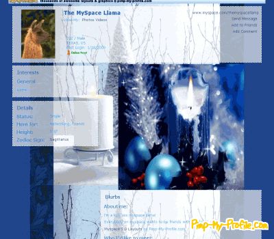 <style type=text/css> .pimp_my_profile { Generated at Pimp My Profile www.pimp-my-profile.com } #profile-container { background-color:transparent; border:none; border-width:0px; } .subsection, .subsection-separator { width:100%; max-width: 600px; } table table table table { width:100%;; } body { background-color:#224488; background-image:url(http://content.pimp-my-profile.com/i128/5/12/10/f_94968e9469.png); background-position:Center Center; background-attachment:fixed; background-repeat:repeat-y; border-width:0px; border-style:Solid; scrollbar-face-color:#ffffff; scrollbar-highlight-color:#22AAFF; scrollbar-3dlight-color:#222288; scrollbar-shadow-color:#2288FF; scrollbar-darkshadow-color:#2244FF; scrollbar-arrow-color:#224488; scrollbar-track-color:#224488; } .subsection, .section h2, .section h1 { border-style:Dashed; border-width:2px; border-color:#ffffff; background-image:url(https://ct.pimp-my-profile.com/tp/ffffff-80-tp.png); background-repeat:repeat; background-attachment:fixed; } table, tr, td, li, p, div, .content, .subsection { color:#22AAEE; font-size:10pt; } .bg_title, .text_header { color:#2266CC; font-size:12pt; } .box_profile_info_small_heading { color:#2288CC; font-size:12pt; } .nametext { color:#2266CC; font-size:14pt; } a:active, a:visited, a:link, a.searchlinksmall:active, a.searchlinksmall:visited, a.searchlinksmall:link, a.navbar:active, a.navbar:visited, a.navbar:link, a.redlink:active, a.redlink:visited, a.redlink:link { color:#224488; font-size:10pt; } a:hover, a.searchlinksmall:hover, a.navbar:hover, a.redlink:hover { color:#22AAEE; font-size:14pt; font-family:comic sans ms; font-weight:bold; } #friends { padding-top:437px; background-image:url(http://content.pimp-my-profile.com/i122/5/12/10/bn_e63a59affc.png); background-position:top center; background-repeat:no-repeat} #p_center .bg_content table {background-image:none; } #pageMessages { background-image:url(https://ct.pimp-my-profile.com/i94/3/11/18/f_faff2fc846d7.gif); padding-top:20px; background-repeat:no-repeat; background-position:top left; } </style>